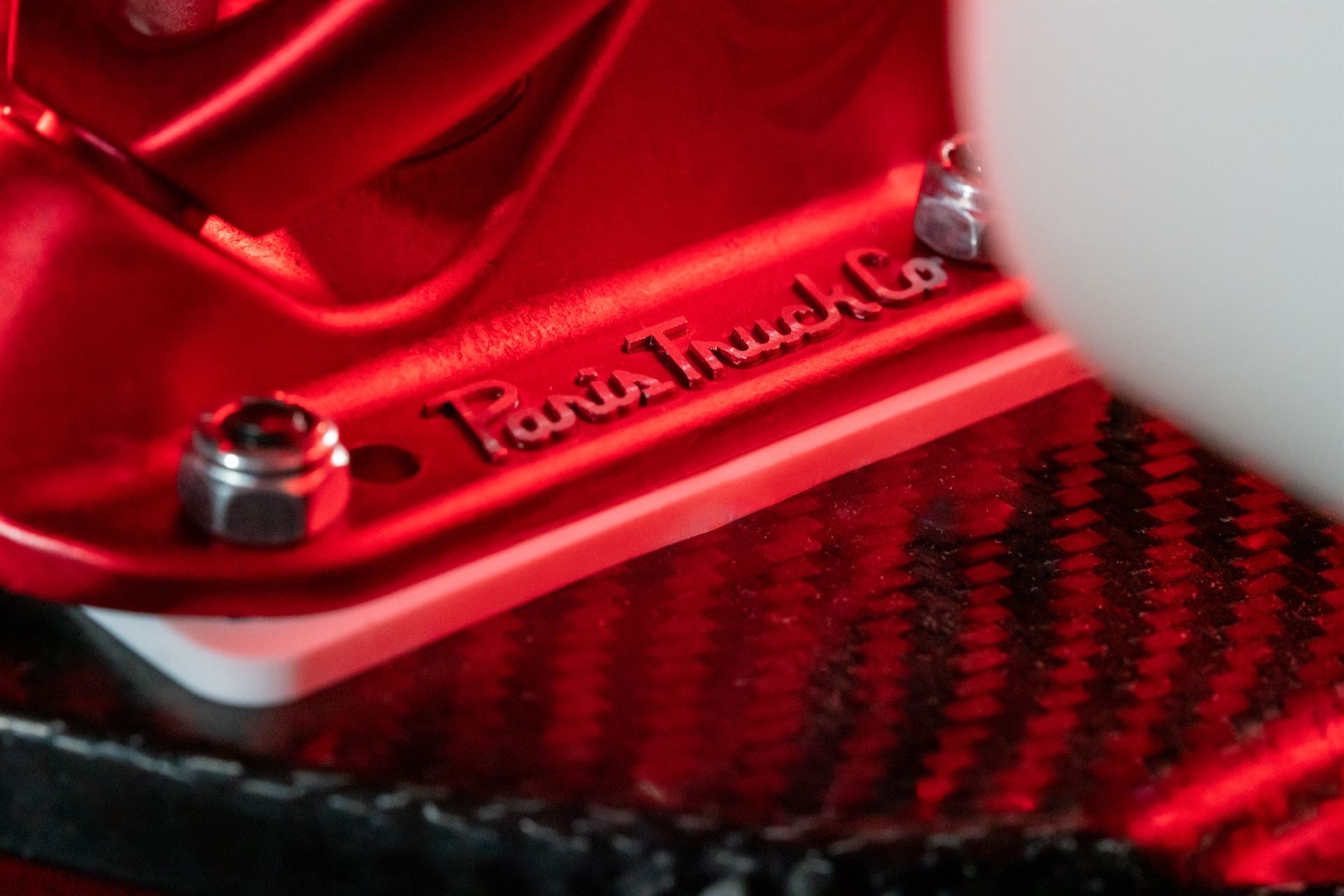 TRUCKS: 180mm Paris V3 Scarlett Red front truck. 180mm Patented Direct Drive Reverse Kingpin Scarlett Red Rear Precision Truck. 50 degree front and 42 degree rear truck base-plate angles. 90A Barrel Bushings.